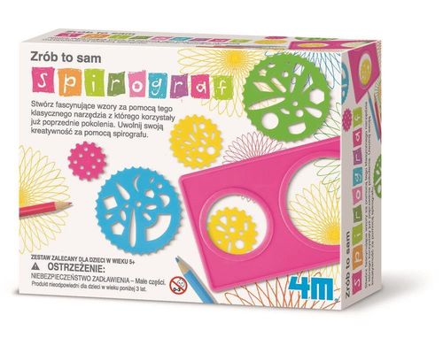 SPIROGRAF Stwórz fascynujące wzory za pomocą tego klasycznego narzędzia z którego korzystały już poprzednie pokolenia. Uwolnij swoją kreatywność za pomocą spirografu ZAWARTOŚĆ: - 1x zestaw spiralnych narzędzi - 3x kredki - papier - szczegółowa instrukcja