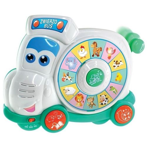 Zabawka interaktywna Zwierzobus - dwujęzyczny pojazd wypełniony po brzegi kolorowymi zwierzątkami!Naciskaj przyciski i przesuwaj dźwignię, aby dowiedzieć się więcej na temat zwierzaków oraz by posłuchać słodkich melodii. ZwierzoBus kryje w sobie też quiz, w którym maluch musi wskazać konkretne zwierzątko. Jeśli znudzi nam się zabawa w języku polskim, wystarczy przełączyć język na angielski i razem z autobusem wyruszyć w zupełnie nową podróż!Funkcje:- przełącznik języka (polski - angielski)- możliwość wyłączenia zabawki (OFF)- quiz (przednie koło, górny przycisk)- ciekawostki ze świata zwierząt (przednie koło, dolny przycisk)- wylosuj zwierzątko i dowiedz się czegoś na jego temat (dźwignia)- wybór konkretnego zwierzątka (tylne koło)UWAGA! W zabawce znajdują się baterie testowe o małej pojemności, co może być przyczyną słabszego działania. Zaleca się wymianę na nowe, alkaliczne. Jeżeli zabawka nie funkcjonuje prawidłowo, należy wyłączyć zabawkę i włączyć ponownie. Jeśli problem nie ustąpi należy wymienić baterie na nowe.UWAGA! Baterie zawarte w zabawce są także przeznaczone do demonstracji w sklepie. Może się zdarzyć, że baterie się wyczerpią przed zakupem przez klienta i klient będzie musiał wymienić zawarte baterie na nowe w celu uzyskania poprawnego działania zabawki. (R)