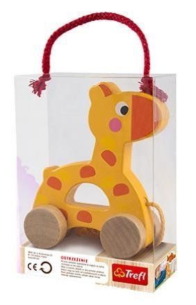 Wesoła Żyrafa Agatka wykonana z jasnego, naturalnego drewna jest doskonałą zabawką, która towarzyszy najmłodszym przy stawianiu pierwszych kroków