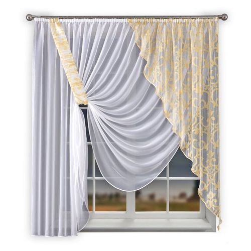 Elegancka gotowa firanka woalowa. Ozdobna firana uszyta z białego woalu, obszyta lamówką oraz upiększona efektownym wzorem w kolorze kremowym. Całość uszyta razem na uniwersalnej taśmie marszczącej (taśmę przy wieszaniu samemu ściąga się do odpowiedniej szerokości).