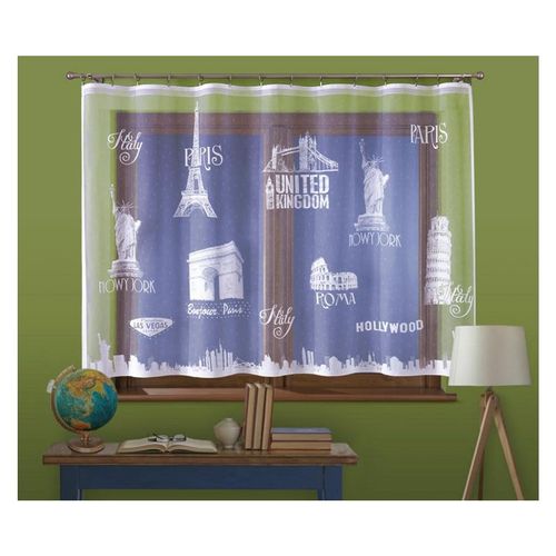 Biała gotowa firanka z motywem najbardziej znanych dzieł architektury światowej. Nowy Jork, Paris, Londyn, Rzym, Hollywood i Las Vegas... najsłynniejsze miasta świata w Twoim oknie.