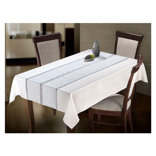 Prostokątny obrus o widocznych łączeniach między nitkami z dekoracyjnym popielatym pasem pośrodku. Trzy cieńsze pasy wykonane są z nabłyszczanej przędzy w kolorze srebrnym.