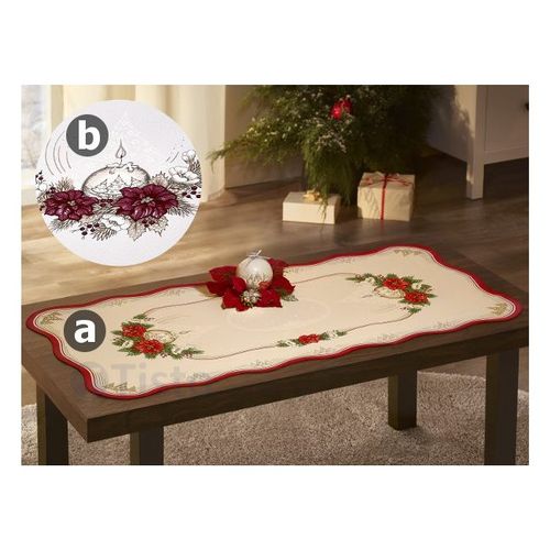 Prostokątny bieżnik z kolekcji Święta Bożego Narodzenia w białym kolorze (z nadrukiem w kolorystyce bordowej). Bieżnik wykonany z tkaniny poliestrowej z ozdobnymi świątecznymi nadrukami, zapewni wigilijną atmosferę w Twoim Domu.