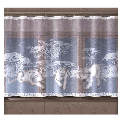 Gotowa firanka z żakardu w białym kolorze z malowanym motywem drapieżnych pum. Efektowna ozdoba okienna dla małych i dużych miłośników dzikiej natury.
