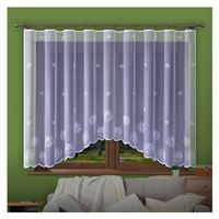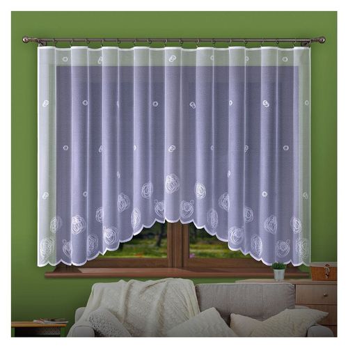 Gotowa żakardowa firana wykończona na dole ozdobnym łukiem, w klasycznym białym kolorze. Zwiewną firankę polecamy do dekoracji okna w Twojej kuchni oraz w salonie i pokoju.
