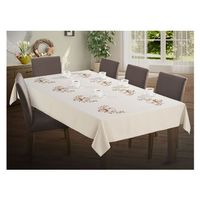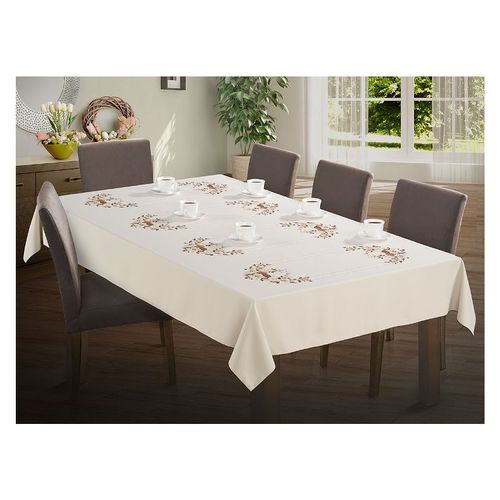 Dekoracyjny obrus w modnym kremowym kolorze, udekorowany świątecznym wzorem w brązowej kolorystyce. Prostokątny obrus z kolekcji Święta Wielkanocne.