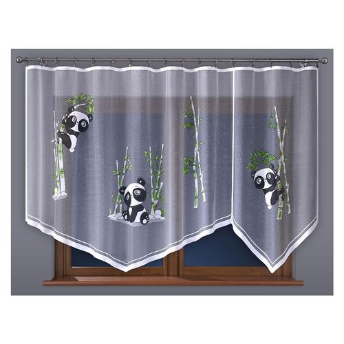 Firana w kolorze białym z malowanymi, kolorowymi niedźwiadkami panda.