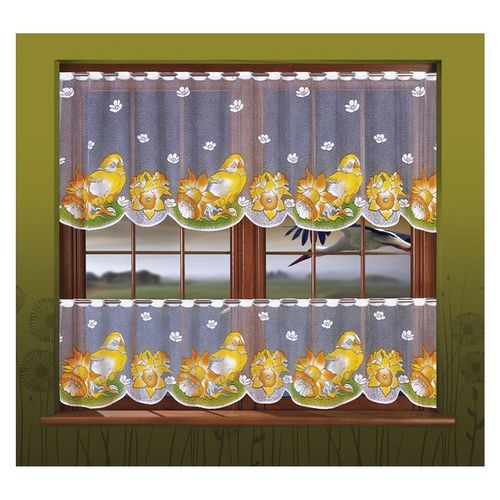 Ozdobna firanka z kolekcji Święta Wielkanocne. Firana żakardowa w kolorze białym z malowanymi kurczaczkami, zapewni świąteczną atmosferę w każdym domu.