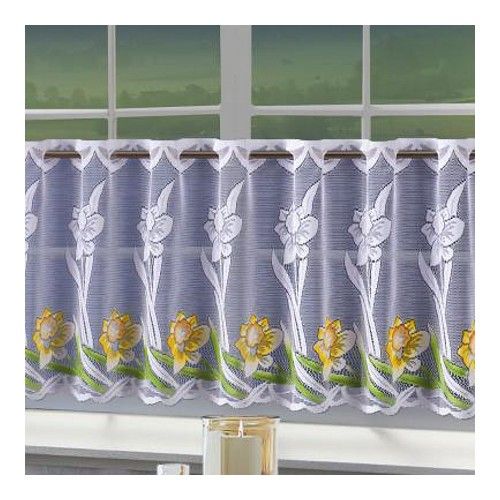 Metrażowa firana z kolekcji Święta Wielkanocne. Firanka z żakardu w białym kolorze z malowanymi żonkilami, zapewni zarówno świąteczną jak i wiosenną atmosferę w Twoim domu.