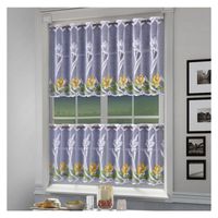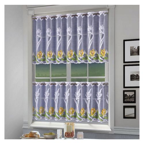 Metrażowa firana z kolekcji Święta Wielkanocne. Firanka z żakardu w białym kolorze z malowanymi żonkilami, zapewni zarówno świąteczną jak i wiosenną atmosferę w Twoim domu.