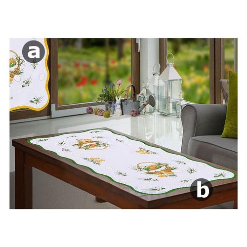 Elegancki bieżnik w klasycznym białym kolorze, ozdobiony kolorowym wzorem świątecznym. Prostokątny bieżnik z kolekcji Święta Wielkanocne.