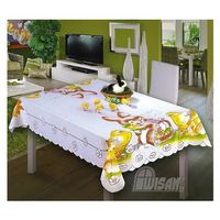 Obrus w kolorze białym z malowanym zajączkiem, zapewni świąteczną atmosferę na spotkaniach w rodzinnym gronie.
