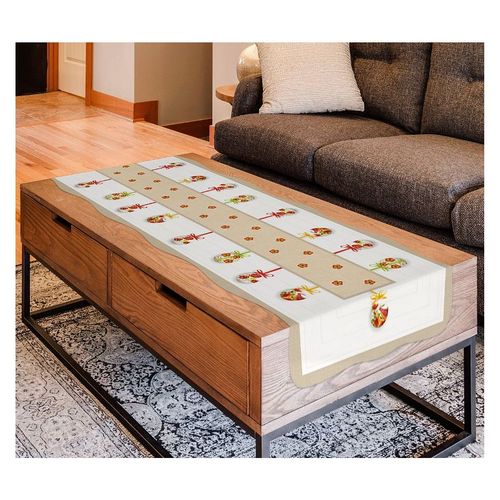 Modny bieżnik w eleganckim białym kolorze, upiększony kolorowym wzorem świątecznym.