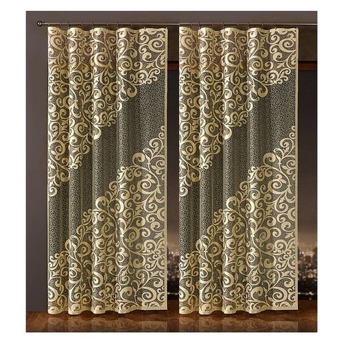 Efektowny panel żakardowy, który upiększy zarówno stylowe, jak i nowoczesne wnętrza. Dekoracja okienna w kolorze beżowym na czarnej osnowie, która podkreśla atrakcyjny wzór.