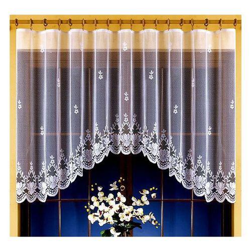 Gotowa firanka wykończona na dole ozdobnym łukiem, w białym kolorze.