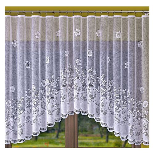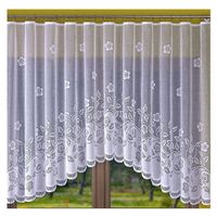 Firana żakardowa z delikatnym wzorem kwiatowym, ozdobiona na dole efektownym łukiem.