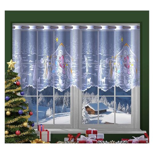 Firana z żakardu w białym kolorze (z kolorowymi ozdobnymi elementami) upiększona wzorem Betlejemskiej Szopki, zapewni moc gwiazdkowych atrakcji i świąteczną atmosferę w każdym domu.