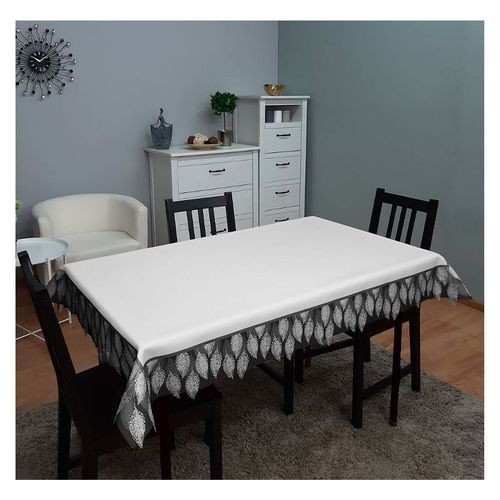 Elegancki obrus w białym kolorze, upiększony dekoracyjnym wzorem w czarnej kolorystyce.