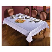Prostokątny, plamoodporny obrus w kolorze białym z delikatnym wzorem zdobniczym.