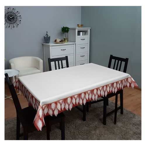 Elegancki obrus w białym kolorze, upiększony dekoracyjnym wzorem w brązowej kolorystyce.