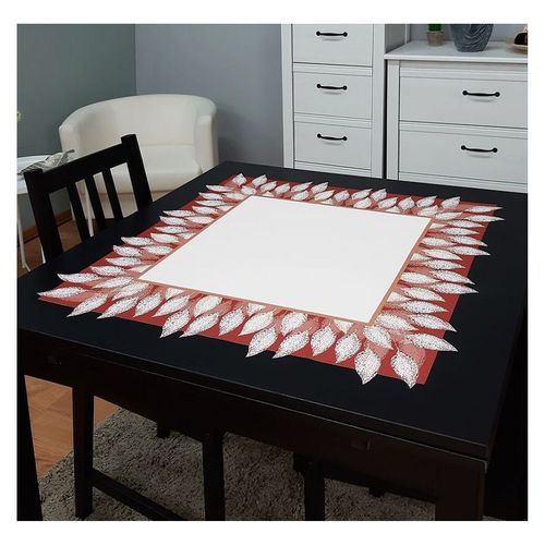 Nowoczesna serweta w kolorze białym, ozdobiona dekoracyjnym wzorem w brązowej kolorystyce.