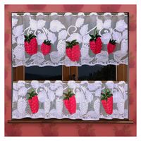 Firanka Maliny dostępna jest w sprzedaży na metry w wysokościach 50 cm i 70 cm oraz w wersji gotowej w rozmiarze 300 x 150 cm