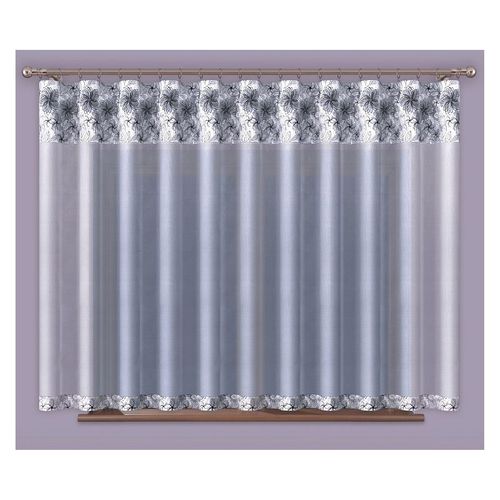 Biała metrażowa firana, na górze i dole wykończona tkaniną ozdobioną szarymi kwiatami.