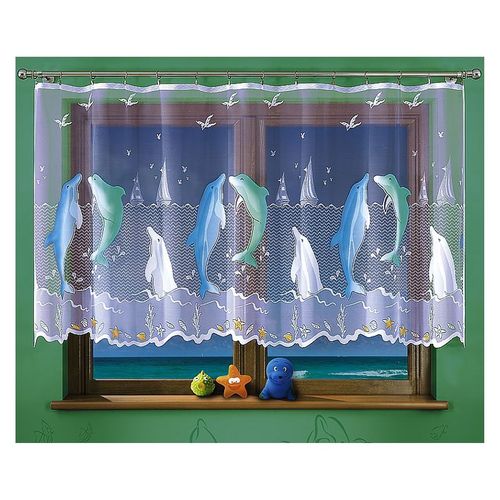 Firanka Delfiny dostępna jest w sprzedaży na metry w wysokościach 50 cm; 70 cm; 120 cm i 160 cm