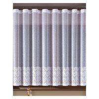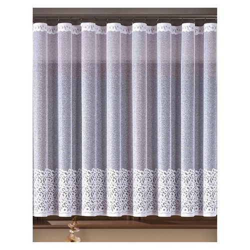 Gotowa firanka z żakardu w klasycznym białym kolorze, na dole upiększona ozdobnym pasem.