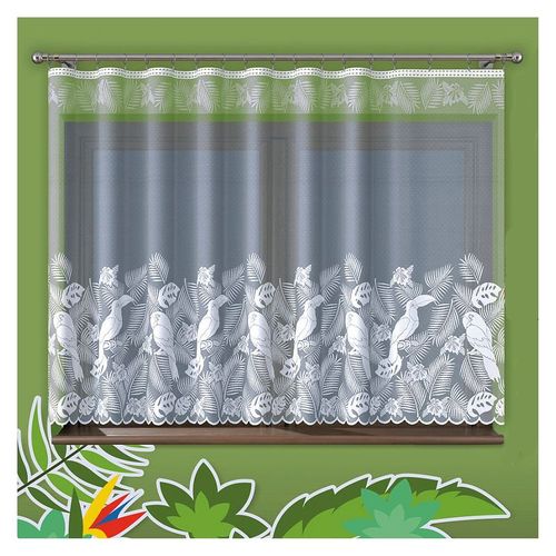 Firanka Papugi dostępna jest w sprzedaży na metry z kolorowym wzorem w wysokościach 50 cm i 70 cm oraz w kolorze białym na wysokość 160 cm