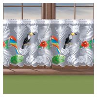 Firanka Papugi dostępna jest w sprzedaży na metry z kolorowym wzorem w wysokościach 50 cm i 70 cm oraz w kolorze białym na wysokość 160 cm