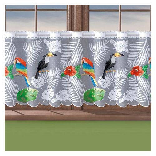Nowoczesna firanka żakardowa w kolorze białym z kolorowymi, egzotycznymi ptakami. Wzór jest drukowany co zapewnia jego trwałość oraz wyraziste kolory.