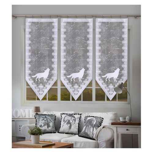Efektowny panel z żakardu w kolorze białym z motywem wilka. Ten gotowy panel to nowoczesna dekoracja okna, idealna do ozdoby pokoju każdego małego i dużego miłośnika dzikiej przyrody.