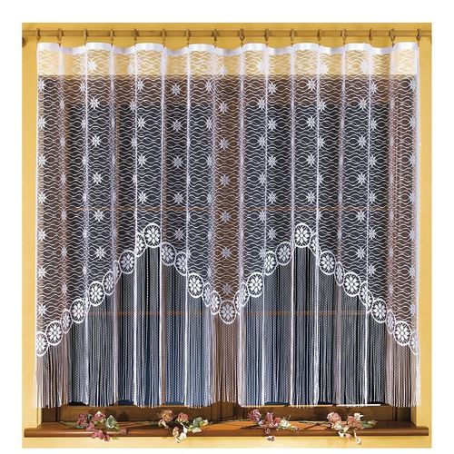 Gotowa firanka z nabłyszczanej przędzy, zakończona frędzlami.