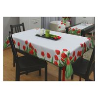 Prostokątny obrus plamoodporny w białym kolorze z kolorowym motywem tulipanów.