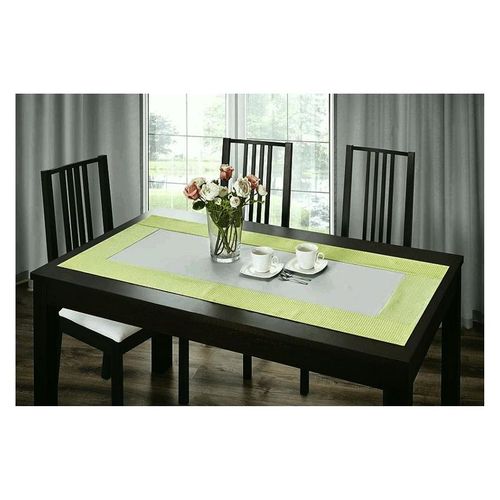 Prostokątny bieżnik z tkaniny dekoracyjnej z nabłyszczaną przędzą, w w kolorystyce srebrno-zielonej.