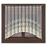 Elegancka, klasyczna firanka wykończona na dole efektownym łukiem. Dekoracja okienna ozdobiona delikatnym, kwiatowym wzorem z zagęszczoną bordiurą w modnym kolorze ecru.