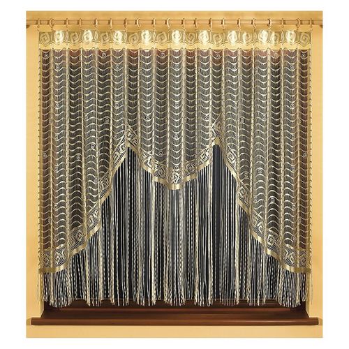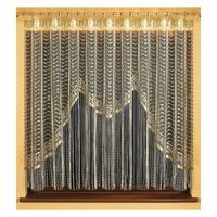 Gotowa firanka z nabłyszczanej złotej przędzy, zakończona frędzlami.