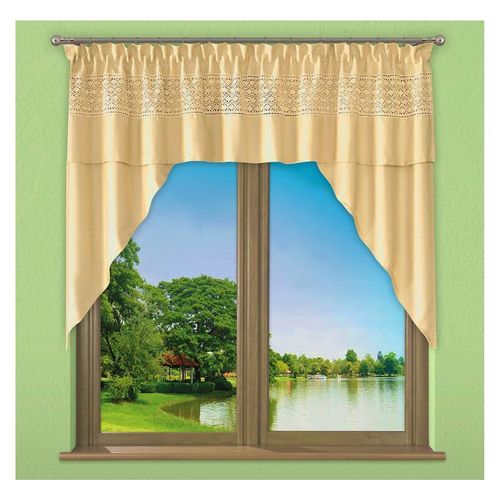 Gotowy lambrekin w efektownym beżowym kolorze, uszyty na taśmie marszczącej 1:2.