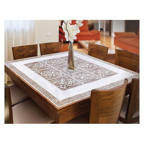 Kwadratowy obrus w białym kolorze, z modnym kwiatowym motywem w formie witrażu.