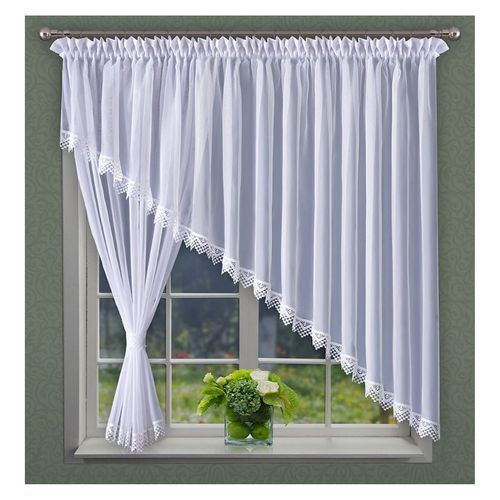 Efektowna firanka woalowa. Gotowa firana w klasycznym białym kolorze na dole wykończona żakardową gipiurą.