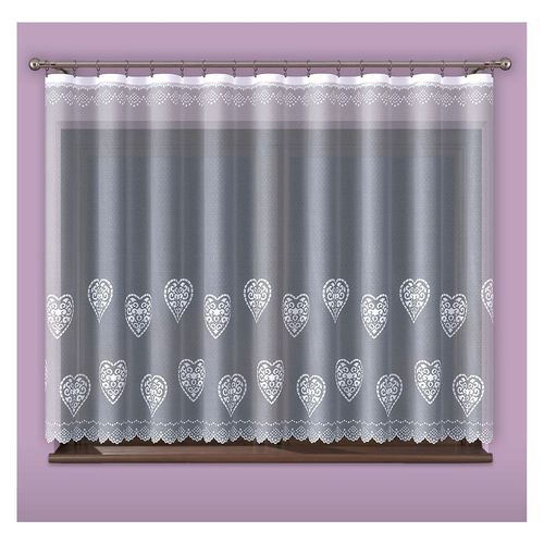Nowoczesna firanka z żakardu, upiększona motywem karcianego serca.