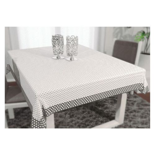 Prostokątny obrus w drukowane kropeczki, z powłoką hydrofobową utrudniającą plamienie. Obrus w modnej biało-szarej wersji kolorystycznej.