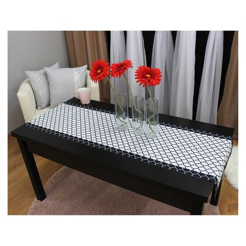 Nowoczesny bieżnik z drukowanym wzorem marokańskiej koniczyny, w efektownej biało-czarnej kolorystyce.