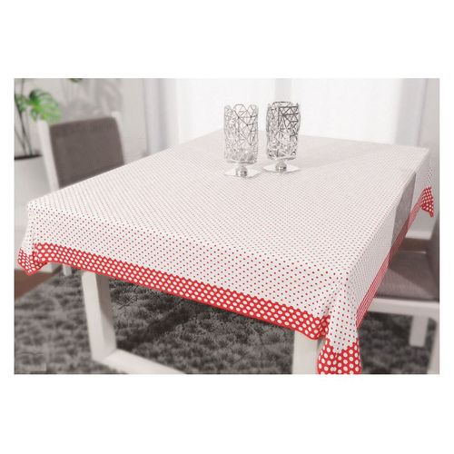 Prostokątny obrus w drukowane kropeczki, z powłoką hydrofobową utrudniającą plamienie. Obrus w modnej biało-czerwonej wersji kolorystycznej.