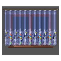 Firanka Papugi dostępna jest w sprzedaży na metry z kolorowym wzorem w wysokościach 50 cm; 70 cm i 150 cm oraz w kolorze białym na wysokość 160 cm
