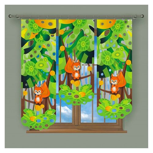Na pierwszym zdjęciu prezentowana jest przykładowa aranżacja składająca się z dwóch paneli Wiewiórki 50 x 140 cm. Na ostatnim zdjęciu widoczny jest przykładowy komplet okienny paneli Wiewiórki w rozmiarach 50 x 160 cm; 50 x 120 cm oraz 50 x 140 cm.