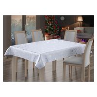Świąteczny obrus w modnym srebrnym kolorze upiększony tłoczonym motywem śnieżynek.