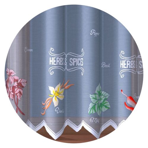 Firanka żakardowa w białym kolorze, ozdobiona kolorowym wzorem ziół i warzyw ogródkowych.