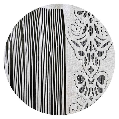 Długa żakardowa firana łącząca w sobie 5 nowoczesnych paneli z klasycznymi frędzlami sznurkowymi (makaronami).